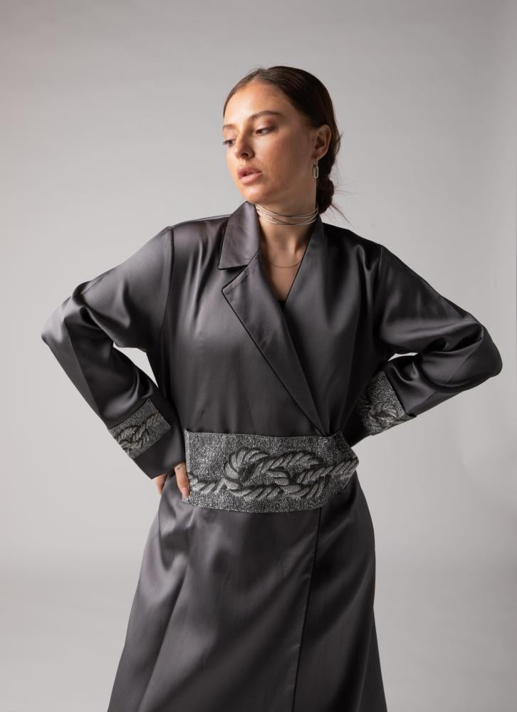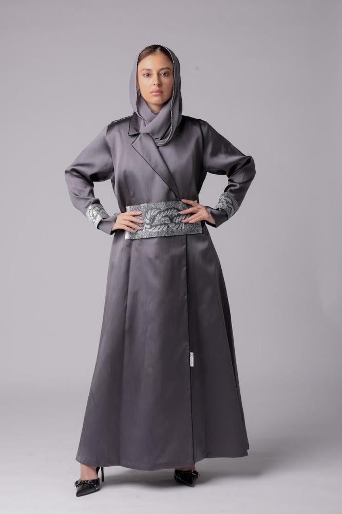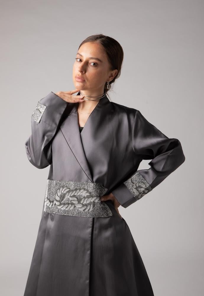 من قماش التفاتا الخفيف الرمادي مع حزام من اللون الفضي الجاكار