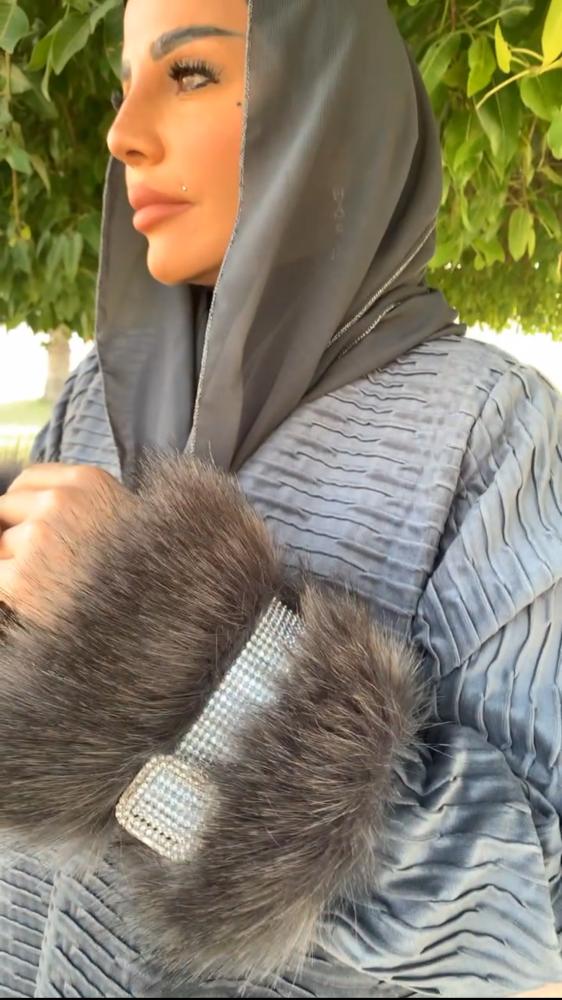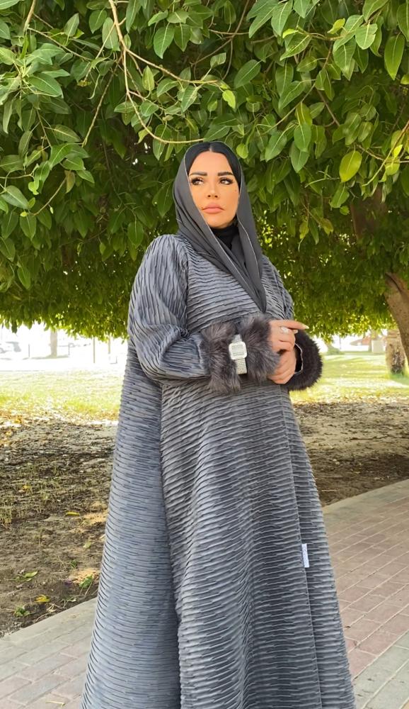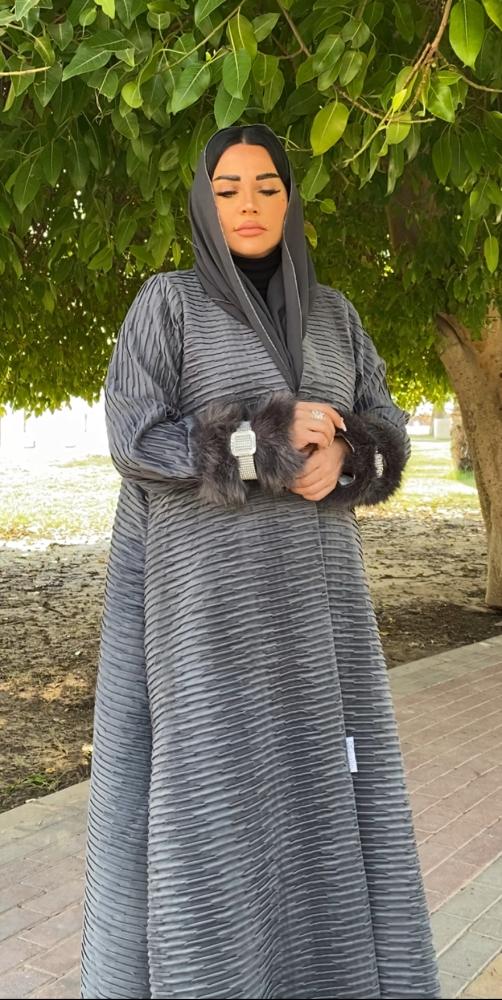 عباية من المخمل الرمادي مع أكمام فروبسوار فضي وقصة A line